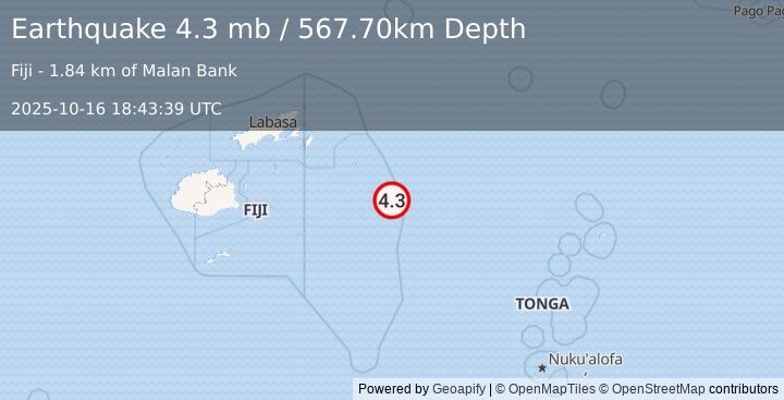 A 4.3 magnitude earthquake struck on FIJI REGION, at 2025-10-16 18:43:39 UTC. Reviewed by EMSC seismologists, this minor quake occurred at a magnitude type of mb and was felt in surrounding areas. Stay updated on earthquake activity in FIJI REGION