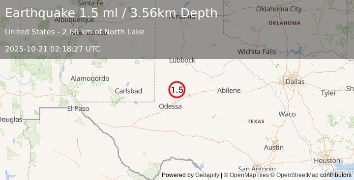Earthquake 32 km SSW of Los Ybanez, Texas (1.5 ml) (2025-10-21 02:18:27 UTC)